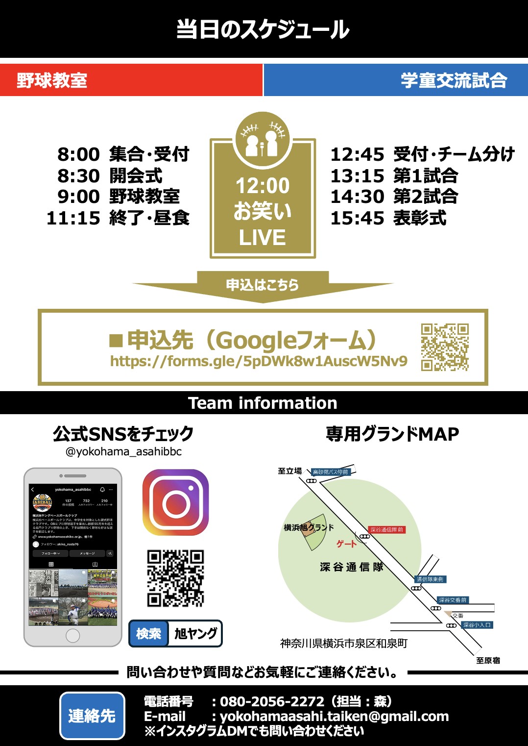 | 【当日の予定】 | 08:00 集合・受付 09:00 元プロが教える野球教室 12:00 お笑いLIVE 13:15 学童交流戦(硬式球) |